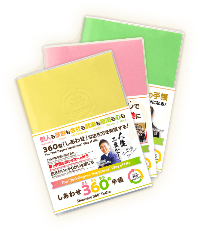 当サイトは、360度「しあわせ」な生き方を実現するための手帳や、セミナーなどが購入できるオンラインショップになってます。「しあわせ360°手帳」を実際に使用していただき、開くたびに意欲が湧いて、また夢や目標へ向かって人生を歩んでいけることを願っています。